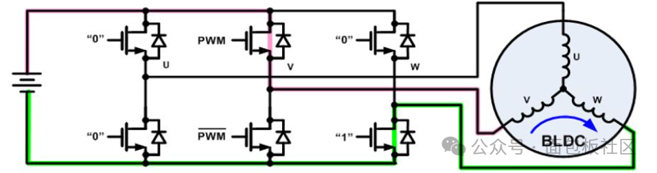 要驅動三相無刷電機,三相繞組每相需要在根據轉子位置狀態(tài),運行在高電位或低電位上。為此,通常采用三個“半橋”驅動電路來實現驅動,每個驅動電路都由兩個開關組成。根據所需的電壓和電流,開關可以是雙極型晶體管、IGBT或MOSFET。