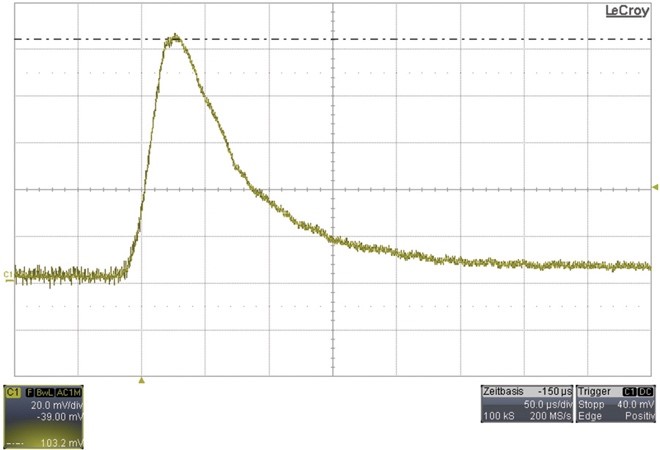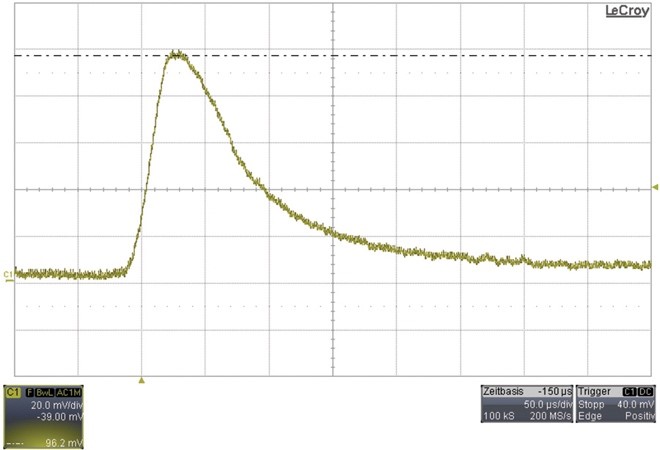 圖3顯示了在負載瞬態(tài)響應期間交流耦合輸出電壓中的電壓尖峰,其測量設置如圖1所示。峰值電壓約為103 mV。相比之下,圖4顯示了連接線的導線整齊絞合在一起(如圖2所示)時的測量結(jié)果。此時,輸出電壓中的電壓尖峰只有大約96 mV。這相當于大約7 mV的差異,它表明連接線的整齊排列可導致該負載瞬態(tài)測試結(jié)果改善大約7%。