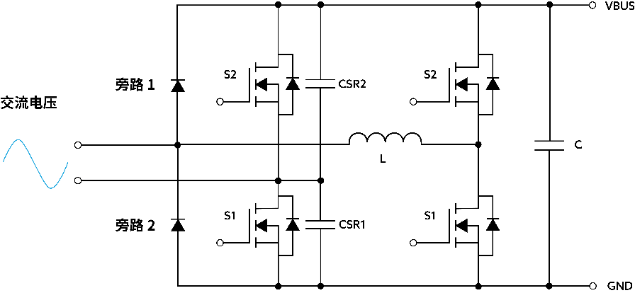 其他常見的拓撲包括半無橋 PFC 和圖騰柱 PFC (TPFC),它們消除了橋式整流器,并且損耗更低。TPFC(圖 3)由 EMI 濾波器、升壓電感器、高頻半橋、低頻半橋、雙通道柵極驅動器和固定頻率 TPFC 控制器組成。