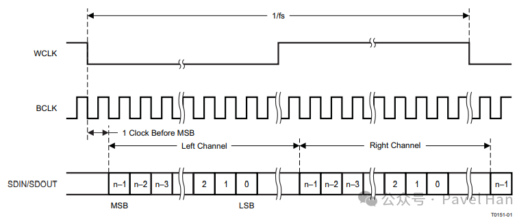 - • WCLK(Word Clock):字選擇信號(hào),用于指示當(dāng)前傳輸?shù)氖亲舐暤肋是右聲道數(shù)據(jù)。通常WCLK為高電平時(shí)傳輸左聲道數(shù)據(jù),為低電平時(shí)傳輸右聲道數(shù)據(jù)。