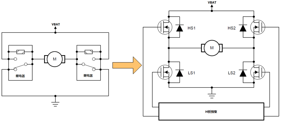 簡單的H橋電路,可以使用兩個(gè)繼電器實(shí)現(xiàn),外部電路驅(qū)動繼電器閉合狀態(tài)即可。這樣的繼電器H橋驅(qū)動雖然簡單實(shí)用,但也有比較大的局限性,例如體積較大和開關(guān)速度較慢,而且在調(diào)速方面也顯得力不從心。在現(xiàn)在高功率密度需求的趨勢下,需要使用更高開關(guān)速度,體積更小的器件去替代繼電器。MOS管開關(guān)速度快,導(dǎo)通阻抗小,過電流能力強(qiáng),非觸點(diǎn)式的電子開關(guān),非常適合用來替代繼電器驅(qū)動有刷直流電機(jī),而且更容易縮小電路占用空間。由于MOS管的開關(guān)速度相對于繼電器來說非常高,所以可以通過PWM的方式來進(jìn)行調(diào)速。汽車電子設(shè)計(jì)的要求越來越高,功能安全與故障檢查機(jī)制是必不可少的一部分,設(shè)計(jì)符合汽車標(biāo)準(zhǔn)的直流有刷電機(jī)的驅(qū)動。