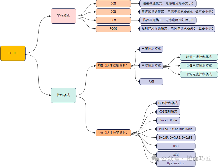 大家好,今天跟大家聊一聊有關(guān)DCDC工作模式和控制模式的基本概念。我們?cè)趯W(xué)習(xí)開(kāi)關(guān)電源的過(guò)程中,經(jīng)常會(huì)遇到各種各樣的概念,比如CCM,DCM,PWM,PFM。。。這些概念種類(lèi)太多,以至于我們時(shí)常會(huì)產(chǎn)生迷糊,甚至?xí)褍蓚(gè)不同維度的概念放到一起比較,這里我們就來(lái)把它們捋一捋,讓大家能夠更清晰的了解到這些概念的區(qū)別。首先我們來(lái)看一張圖,工作模式和控制模式可以歸納總結(jié)為圖中的幾種方式,下面我們來(lái)逐步把這些模式講清楚。