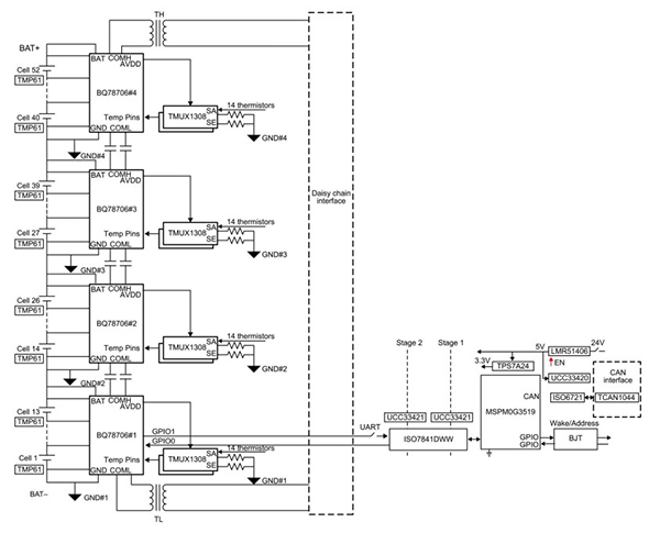 圖 2. 適用于儲能系統(tǒng)參考設計的電池控制單元參考設計圖(顯示了可堆疊 BMU 架構)