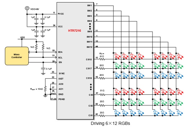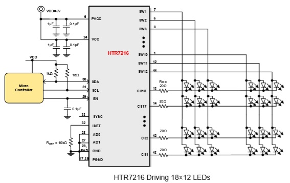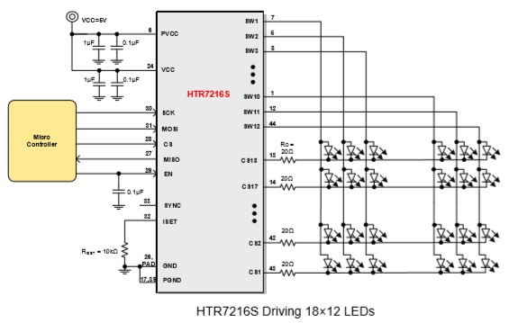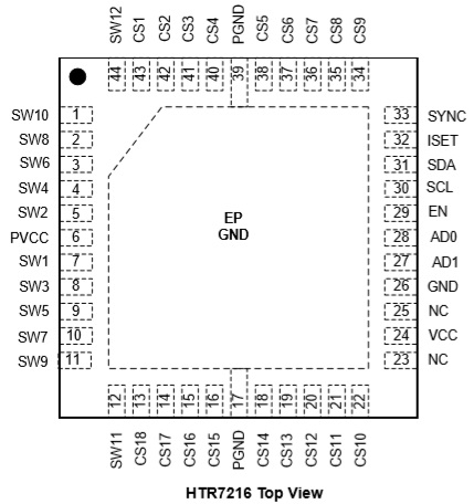 HTR7216(S)是一款通過1MHz的I2C接口 (HTR7216)或10MHz SPI接口(HTR7216S)進行編程的支持18×12陣列的LED驅(qū)動芯片,每路SWx都支持8位PWM數(shù)據(jù)進行獨立調(diào)光,并且每路CSx都有8位的直流掃描數(shù)據(jù)用來支持每個點的256階的線性PWM調(diào)光,并且每個CSx都支持256階的直流電流可調(diào)節(jié)等級。