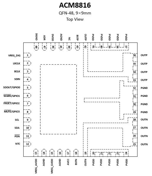 ACM8816采用QFN-48(9.0mm× 9.0mm)封裝。