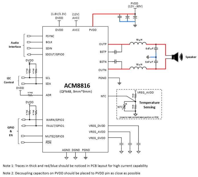 ACM8816是一款集成GaN HEMT的器件,高效、高性能具有數(shù)字輸入的單聲道D類音頻放大器。外圍應(yīng)用電路只需要很少的無源元件,能在4.5V至50V的PVDD和AVCC電源、3.3V或1.8V的DVDD電源下工作。ACM8816集成了7mΩRdson-GaN-HEMT,驅(qū)動(dòng)到4Ω可以在10%THD+N內(nèi)輸出1×340W的功率,而不需要散熱器。