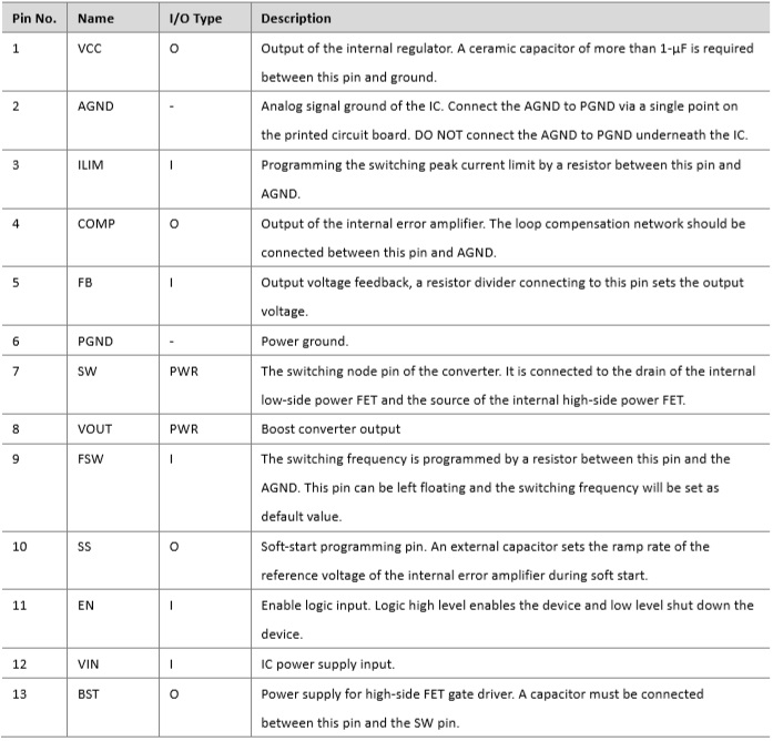 ACM5620采用自適應(yīng)恒定關(guān)斷時間峰值電流控制模式,以調(diào)節(jié)輸出電壓并確?焖偎矐B(tài)響應(yīng)。ACM5620在脈沖寬度下工作中、重載時的調(diào)制(PWM)模式,隨著負(fù)載電流的減小切換到脈沖頻率調(diào)制(PFM)模式以保持高效運(yùn)行。ACM5620提供準(zhǔn)確在寬負(fù)載和VIN范圍內(nèi)進(jìn)行調(diào)節(jié),并保持低輸出紋波。ACM5620提供22.8V的過電壓保護(hù),電流跟蹤保護(hù)和過熱保護(hù)。