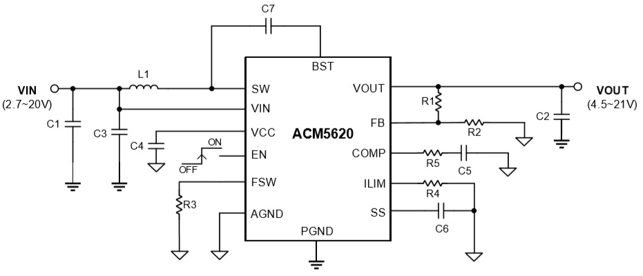 ACM5620是一款全集成的高效DC-DC升壓轉(zhuǎn)換器。內(nèi)部集成6.5mΩ Rson功率開關(guān)管以及10mΩ的Rdson同步整流管,低導(dǎo)通內(nèi)阻保證了高效率和良好的熱性能表現(xiàn)。ACM5620具有寬的輸入電壓范圍2.7V至20V;輸出電壓范圍4.5V-21V;非常適合1-3節(jié)鋰電池的應(yīng)用場合