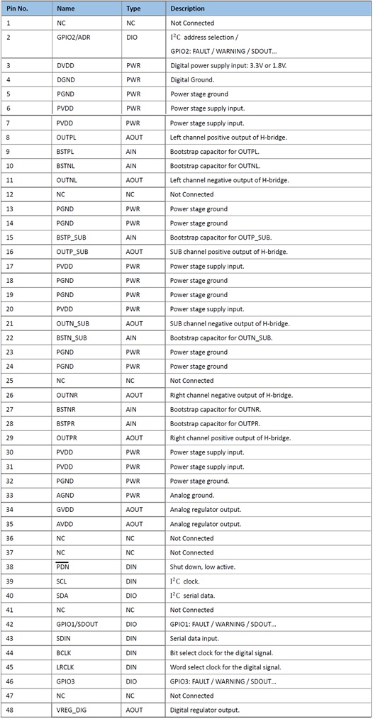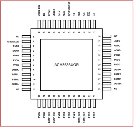 ACM8815 1×200W,4Ω,36V,THD+N<10% QFN-48 4.5V-38V 內(nèi)置DSP、I2S數(shù)字輸入200W大功率單聲道D類功放IC,大功率輸出無需外接散熱器