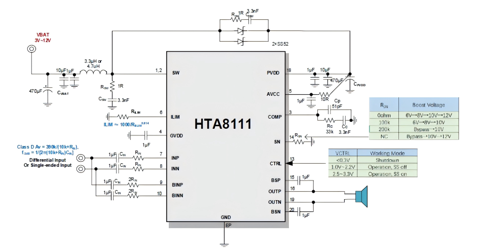 HTA8111內(nèi)置可動態(tài)調(diào)節(jié)的升壓,可提供一個適應(yīng)不同輸出功率的電壓給D類功放,可大幅提高系統(tǒng)效率,延長電池續(xù)航時間。還可配置升壓限流值,以防止過大的電流尖峰。