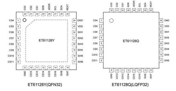 ET61128采用標(biāo)準(zhǔn)I²C接口,支持400KHz高速通訊,具備連續(xù)讀寫(xiě)功能,4個(gè)片地址可選,方便多設(shè)備協(xié)同工作。芯片內(nèi)部集成開(kāi)短路檢測(cè)、軟硬件關(guān)斷、擴(kuò)頻及消隱功能,確保系統(tǒng)穩(wěn)定運(yùn)行,延長(zhǎng)LED壽命。靜態(tài)電流低至3mA,關(guān)斷模式功耗僅3uA,延長(zhǎng)電池設(shè)備續(xù)航。封裝采用QFN32(4mm×4mm)和LQFP32(7mm×7mm),可適應(yīng)不同空間需求。
