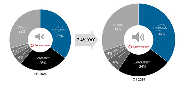 市場研究機構 Counterpoint 咨詢發(fā)布報告,目前全球乘用車音響系統(tǒng)市場由 Harman 和 Bose 主導,兩家廠商合計貢獻近 60% 的總銷售額。