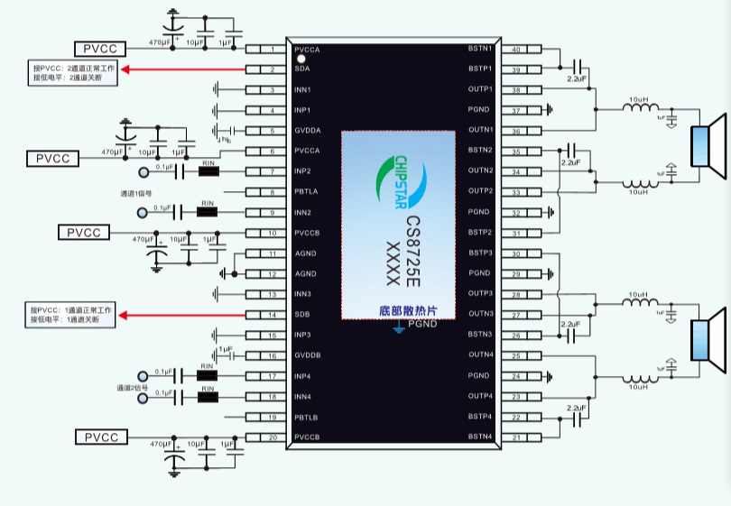 CS8725E是-款4X45W四通道D類音頻功率放大器,其可以兼容2.0/2.1/4.0多聲道音頻應用,這款器件在底部設計了散熱焊盤,在供電電壓24V的情況下,8Ω負載最大可以輸出4x42W的連續(xù)功率.