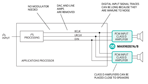 由于其高效率和出色的EMI性能,無濾波器數(shù)字輸入D類放大器已成為消費電子設備中驅(qū)動揚聲器的公認標準。這是因為它們不受與模擬對應物相關的電路板設計問題的影響,最具體地說是信號完整性。單通道數(shù)字D類放大器可以放置在電路板上的遠程位置,以最大限度地減少大電流電池和揚聲器負載連接的布線。這些放大器不需要模擬輸入D類設計所需的DAC和線路驅(qū)動器。因此,空間和系統(tǒng)成本下降,設計變得更加簡單。許多D類放大器接受脈沖編碼調(diào)制(PCM)或I類放大器2需要三根導線的 S 數(shù)據(jù):BCLK、LRCLK 和 DIN(圖 2)。PCM 數(shù)據(jù)格式不需要調(diào)制器或應用處理器上數(shù)據(jù)的上采樣來提供立體聲數(shù)據(jù)。