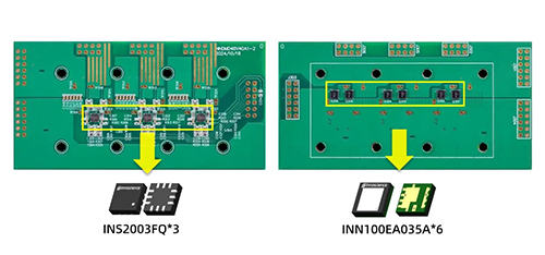 6顆INN100EA035A分立器件+3顆INS2003FQ專用驅(qū)動(dòng)IC,更好地發(fā)揮了分立方案靈活性。