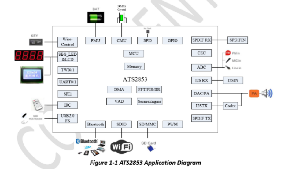 • ATS2853只支持經(jīng)典藍(lán)牙,可以利用TWS機(jī)制實(shí)現(xiàn)高集成度和極高性價(jià)比的soundbar+subwoofer產(chǎn)品;