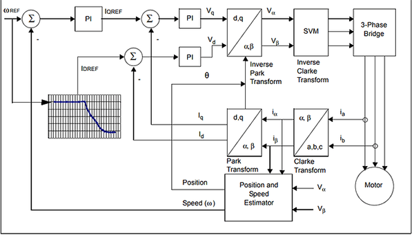 框圖中 Iq 和 Id 的獨(dú)立 PI 控制器是 FOC 實(shí)現(xiàn)精準(zhǔn)控制的關(guān)鍵: