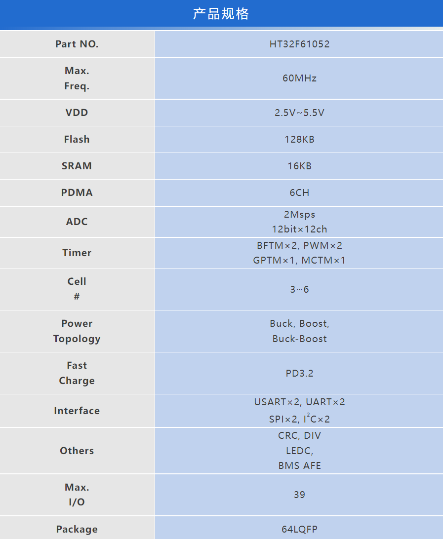Holtek針對(duì)PD充電鋰電池產(chǎn)品,推出Arm® Cortex®-M0+ MCU HT32F61052,符合USB-PD 3.2規(guī)范并兼容Dual Role Port (DRP)雙向角色,內(nèi)建VCONN提供Type-C E-maker電源,允許最大48V/5A(240W) 功率,并支持3~6串的鋰電池保護(hù),適合應(yīng)用于PD應(yīng)急啟動(dòng)電源、PD便攜型充氣泵、PD工具電池包等。