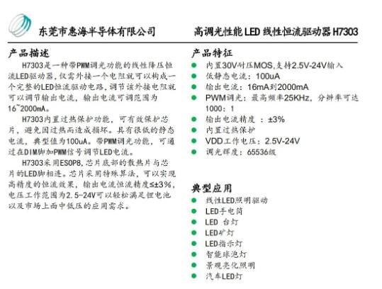 H7303 是惠海半導(dǎo)體推出的一種帶 PWM 調(diào)光功能的線性降壓恒流 LED 驅(qū)動器。以下是其詳細介紹: