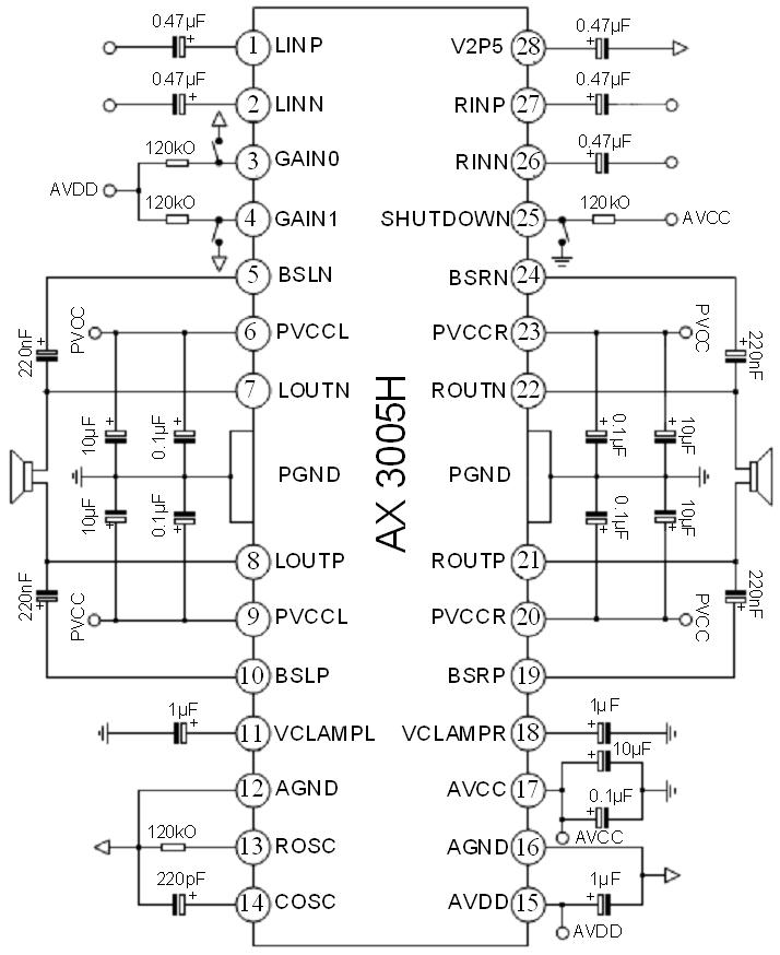 AX3005 是一款用于驅(qū)動(dòng)橋接立體聲揚(yáng)聲器、每聲道 10W 的高效 D 類音頻放大器。它可以驅(qū)動(dòng)低至 8 Ω 的立體聲揚(yáng)聲器。當(dāng)播放音樂時(shí),由于 AX3005 的高效率,因此不需要額外的散熱片。放大器的增益由兩個(gè)增益選擇端控制?蛇x的增益包括 15.3、21.2、27.2 和 31.8 dB。電路具有輸出短路保護(hù)功能,可防止輸出端到電源、地及其它輸出端的短路。熱保護(hù)功能可保證芯片不會超過最大結(jié)溫。