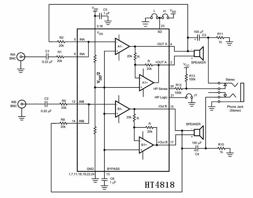 HT4818芯片是一款雙通道的橋接音頻功率放大器,可以利用5V的供電提供2.1W的輸出功率,并將之輸入4W的負(fù)載,也可提供2.4W的輸出功率,然后將之輸入3W的負(fù)載,而總諧波失真及噪音不會(huì)超過(guò)1.0%。HT4818芯片也設(shè)有兩個(gè)獨(dú)立的耳機(jī)啟動(dòng)輸入,每一輸入都有不同的邏輯電平閾值。兩個(gè)耳機(jī)啟動(dòng)輸入都可各自啟動(dòng)單端耳機(jī)模式,以及關(guān)閉橋接負(fù)載輸出模式。耳機(jī)感測(cè)輸入功能是專(zhuān)為正常的立體聲耳機(jī)插孔而設(shè)。余下的輸入耳機(jī)邏輯可以接受正常的邏輯電平閾值。HT4818芯片將雙橋接揚(yáng)聲器放大器和立體聲耳機(jī)放大器集成到單芯片之內(nèi),有助精簡(jiǎn)音頻系統(tǒng)的設(shè)計(jì)。