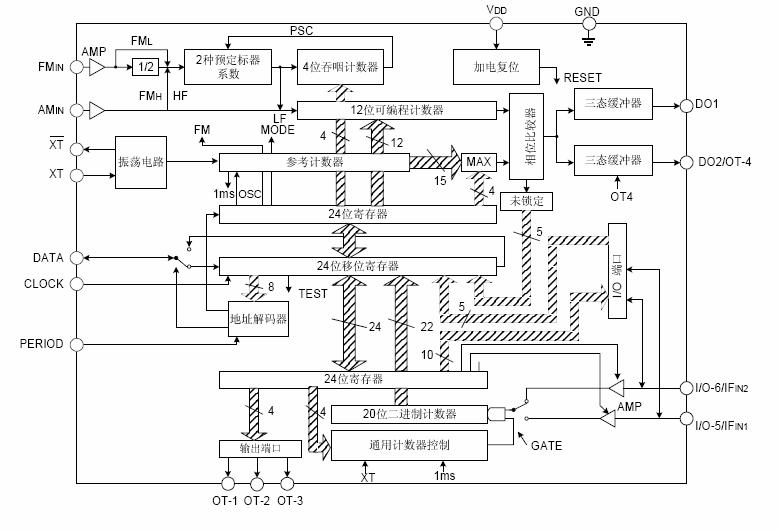 * 內(nèi)置20位通用計(jì)數(shù)器,用來測(cè)量中頻頻率(IFIN1和IFIN2)。