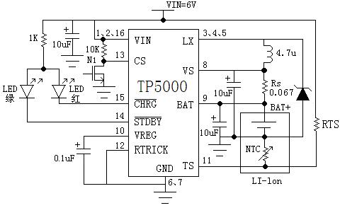 TP5000是一款開關(guān)降壓型單節(jié)錳鋰電池/磷酸鐵鋰電池充電管理芯片。其QFN16超小型封裝與簡單的外圍電路,使得TP5000非常適用于便攜式設(shè)備的大電流充電管理應(yīng)用。同時,TP5000內(nèi)置輸入過流、欠壓保護(hù)、芯片過溫保護(hù)、短路保護(hù)、電池溫度監(jiān)控、電池反接保護(hù)。TP5000具有寬輸入電壓,對電池充電分為涓流預(yù)充、恒流、恒壓三個階段,涓流預(yù)充電電流、恒流充電電流都通過外部電阻調(diào)整,最大充電電流達(dá)2A。TP5000采用頻率800kHz的開關(guān)工作模式使它可以使用較小的外圍器件,并在大電流充電中仍保持較小的發(fā)熱量。TP5000內(nèi)置功率PMOSFET、防倒灌電路,所以無需防倒灌肖特基二極管等外圍保護(hù)。TP5000的恒流功能,也可以用在2串鋰電池或4串干電池輸入,恒流驅(qū)動0.5-7W白光LED。