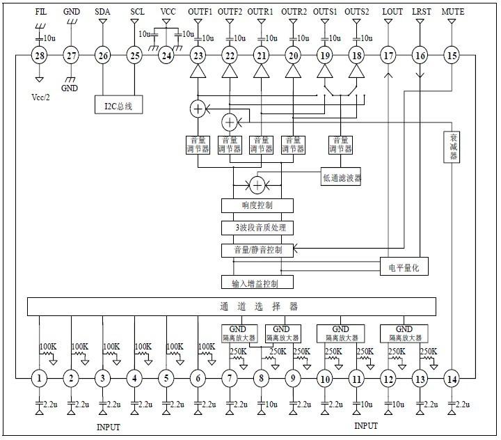 全集成低音,中音,高音,響度濾波器,無需外圍元件;為重低音通道設(shè)置低通濾波器并且GV、Q、fc 受控于I2C 總線,數(shù)據(jù)控制簡單;