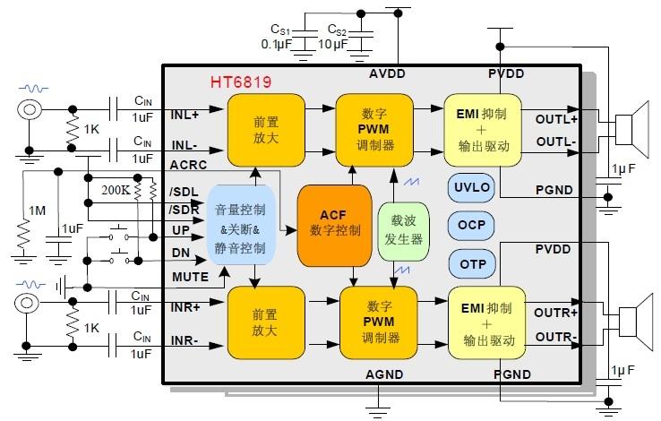 擴(kuò)頻模式,靜音功能,三種防破音模式,AB/D切換,內(nèi)置升壓,18W單聲道音頻功放 |