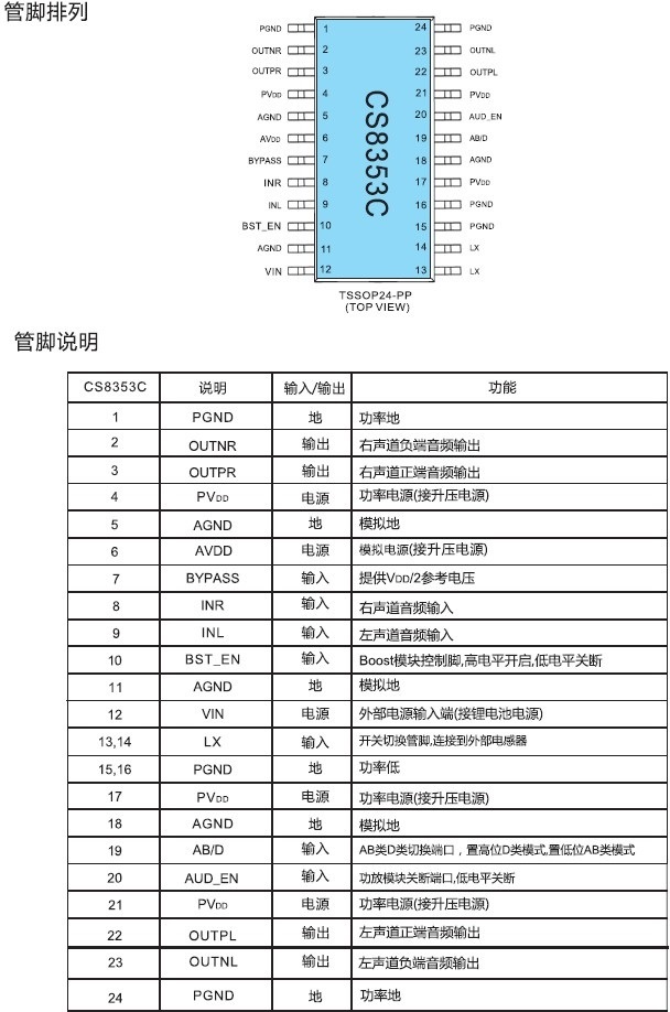 恒定4.8W/2.5V-5.5V(內(nèi)置自適應(yīng)Charge Pump模塊)/4Ω |
