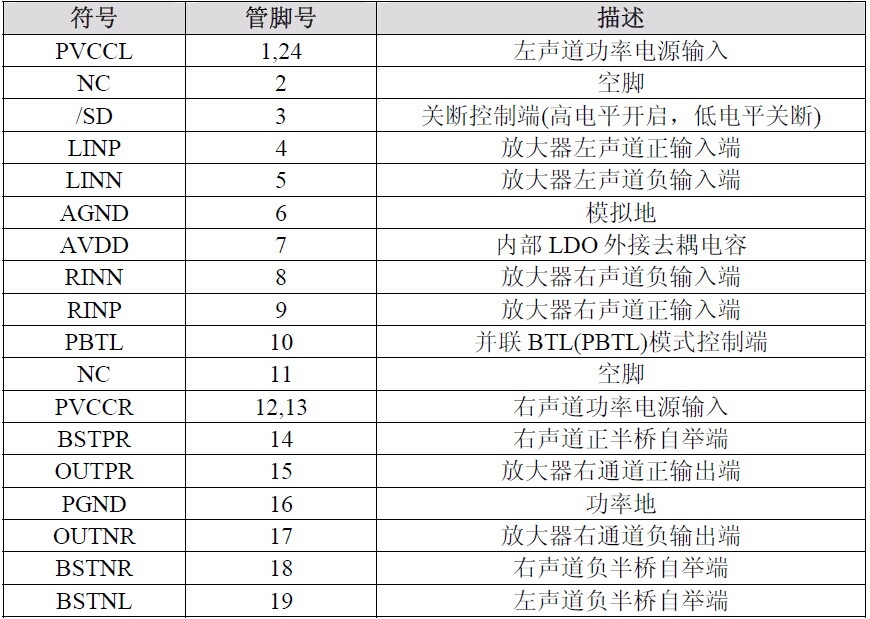 2×20W (VDD=14.5V, RL=4Ω, THD+N=1%) 或2×25W (VDD=14.5V, RL=4Ω, THD+N=10%) |