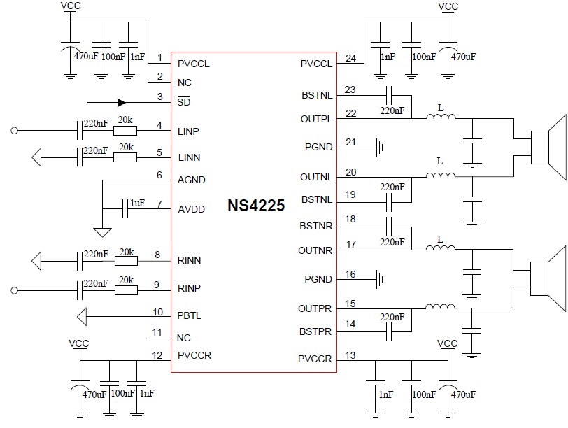當(dāng)前位置:首頁->產(chǎn)品展示->功放IC->NS4225(雙聲道2X25W、單聲道50W、D類音頻功放IC) |