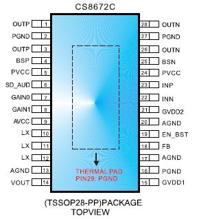 CS8672C提供了纖小的TSSOP-28封裝形式供客戶選擇,,可以為客戶節(jié)省可觀的PCB面積,其額定的工作溫度范圍為-40℃至85℃。