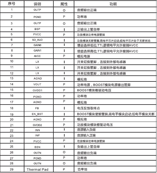 產(chǎn)品功能: PO at 10% THD+N, VIN = 7.4V RL = 4 Ω 280W(BOOST升壓值為15V) VIN = 12V RL = 4 Ω 5.00W(BOOST升壓值為16V)