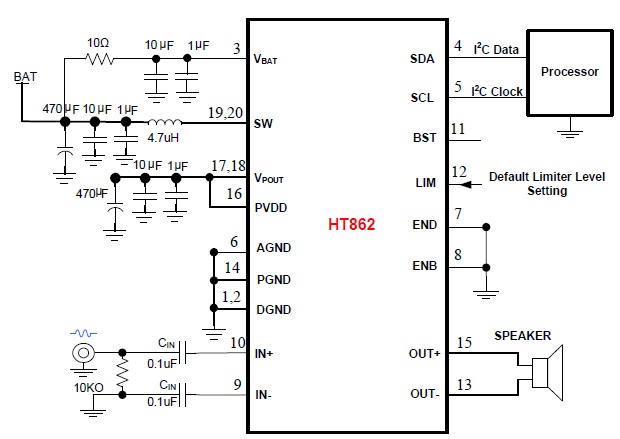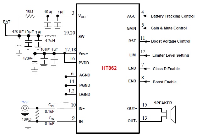 當前位置:首頁->產品展示->功放IC->HT862(內置自適應同步升壓/AGC/限溫功能8W單聲道智能音頻功率放大器)