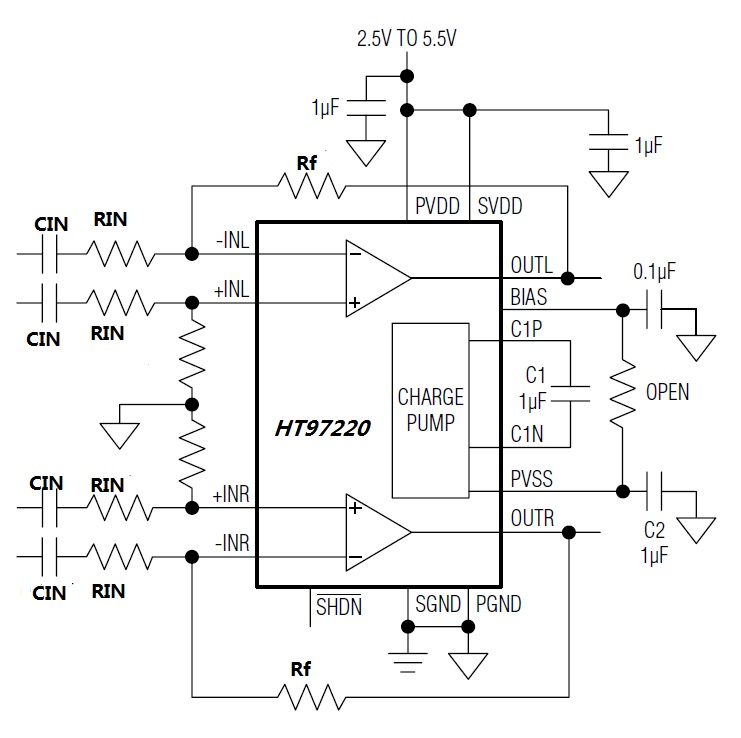 HT97220 為差分輸入、可直接輸出的線路驅動器/耳機放大器。5V供電時,器件為1kΩ負載提供3VRMS輸出驅動;3.3V供電時,為600Ω負載提供2VRMS輸出驅動。5V供電時,器件為32Ω耳機負載提供125mW驅動。IC具有6dB內部固定增益,也可利用外部電阻設置增益。IC在整個音頻頻帶內提供優(yōu)異的THD+N。
