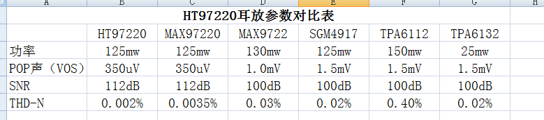 下圖為HT97220對比MAX97220/MAX9722/SGM4917等主流耳放的參數(shù)表