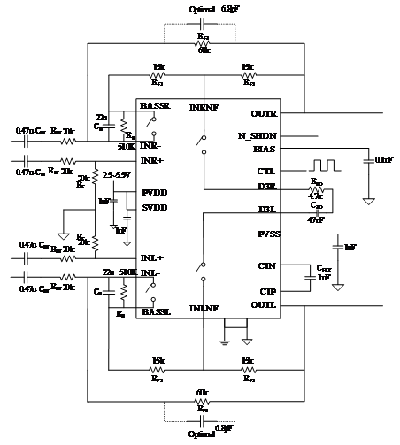 HT97230為差分輸入、可直接輸出的線路驅動器/耳機放大器。5V供電時,器件為1kΩ負載提供3VRMS輸出驅動;3.3V供電時,為600Ω負載提供2VRMS輸出驅動。5V供電時,器件為32Ω耳機負載提供125mW驅動。IC具有6dB內部固定增益,也可利用外部電阻設置增益(目前僅提供外部電阻設置增益版本,其他版本需預定)。IC在整個音頻頻帶內提供優(yōu)異的THD+N。