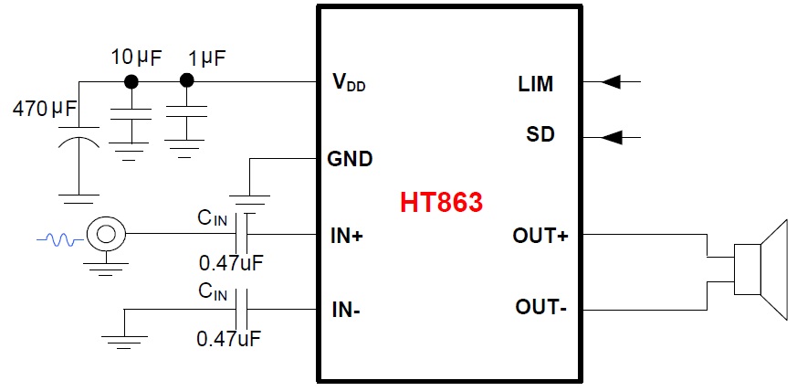 此外,HT863內(nèi)部集成免濾波器調(diào)制技術(shù),能夠直接驅(qū)動(dòng)揚(yáng)聲器,內(nèi)置的關(guān)斷功能使待機(jī)電流最小化,還集成了輸出端過(guò)流保護(hù)、片內(nèi)過(guò)溫保護(hù)和電源欠壓異常保護(hù)等功能。