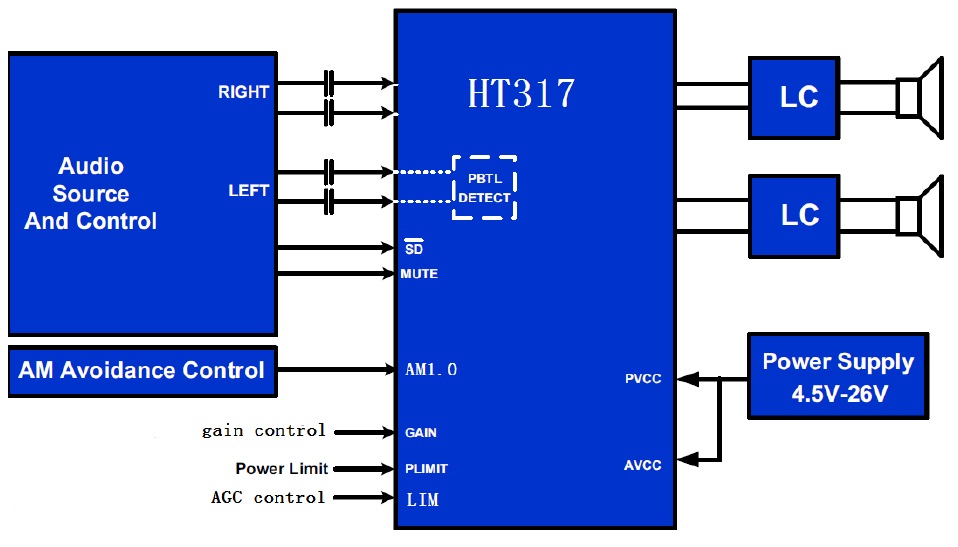 HT317具有過溫限幅功能,當芯片內(nèi)部溫度達到過溫限幅點,HT317自動降低增益,使其IC能夠連續(xù)播放而不間斷。另外,HT317具有功率限制功能,一種是限幅功能,在輸出端限制一定的輸出幅度,使其不損壞喇叭。另一種為AGC防削頂失真功能,開啟后,可有效改善因輸入幅度過大或者電源電壓降低造成的破音失真。