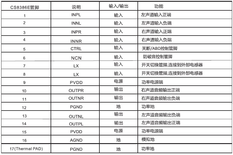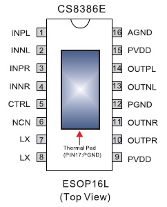 CS8386E提供了纖小的的ESOP16L封裝形式供客戶選擇,其額定的工作溫度范圍為-40℃至85℃.