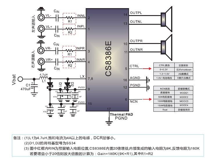 CS8386E的全差分架構(gòu)和極高的PSRR有效地提高了CS8386E對RF噪聲的抑制能力.無需濾波器的PWM調(diào)制結(jié)構(gòu)及內(nèi)置的BOOST升壓模塊,盡可能的減少了外圍器 件,另外CS8386E內(nèi)置了過流保護,短路保護和過熱保護,有效的保護芯片在異常的工作條件下不被損壞。