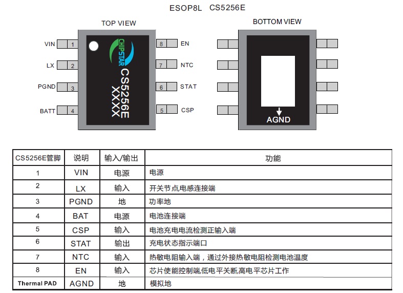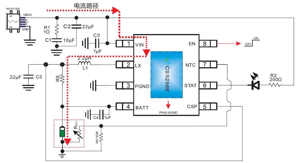 產(chǎn)品功能: CS5256E是一款5V輸入,支持單節(jié)鋰電池或鋰離子聚合物電池的降壓充電管理IC。CS5256E集成功率MOS,采用同步開關(guān)架構(gòu),使其在應(yīng)用時僅需極少的外圍器件, 可有效減少整體方案尺寸, 降低BOM成 本。CS5256E轉(zhuǎn)換器具有2A的充電電流能力,充電電流可以通過外部電阻靈活可調(diào), 充電效率可以達到 90%以上。