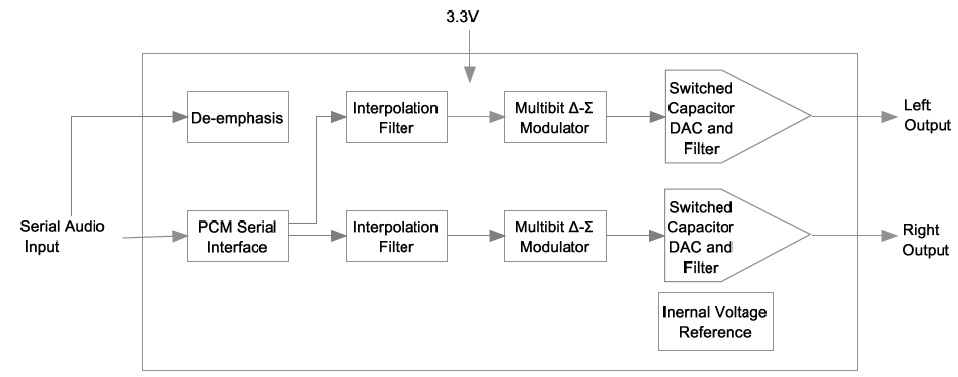 該系列產(chǎn)品基于一個多比特位的Δ-Σ調(diào)制器,將數(shù)字信號轉(zhuǎn)化成兩個聲道的模擬信號并經(jīng)過模擬濾波器濾波。該Δ-Σ調(diào)制器對時鐘抖動的敏感度很低,且在帶寬范圍外具有極低的噪聲。其還可使用采樣率和主時鐘比作為自采樣率(2kHz – 200kHz),從而實現(xiàn)自動檢測采樣頻率的功能。