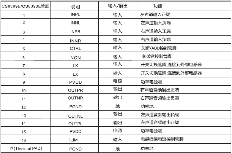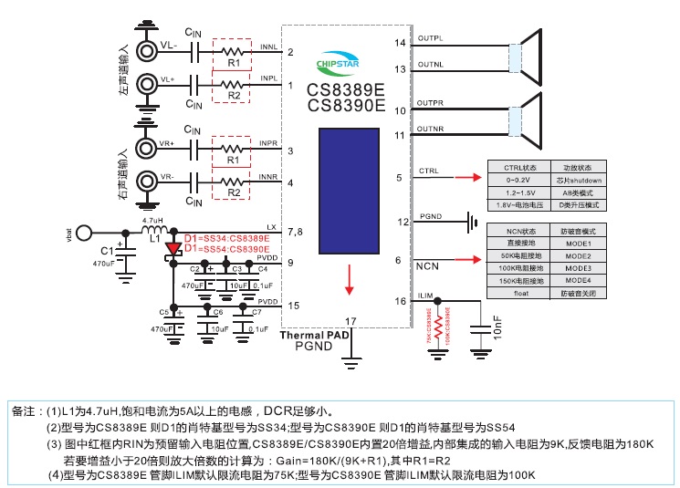 CS8389E/CS8390E的全差分架構(gòu)和極高的PSRR有效地提高了CS8389E/CS8390E對RF噪聲的抑制能力。無需濾波器的PWM調(diào)制結(jié)構(gòu)及內(nèi)置的BOOST升壓模塊,盡可能的減少了外 圍器件,另外CS8389E/CS8390E內(nèi)置了過流保護和過熱保護,有效的保護芯片在異常的工作條件下不被損壞。