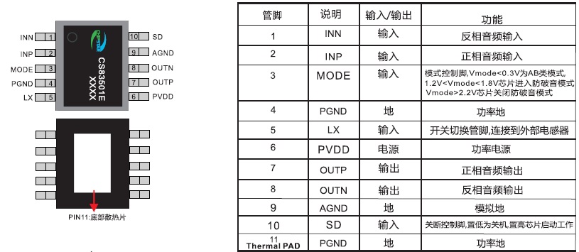 產(chǎn)品名稱(chēng): CS83501(自帶升壓?jiǎn)喂?jié)鋰電恒定8W功率單聲道AB/D類(lèi)切換音頻功放IC)