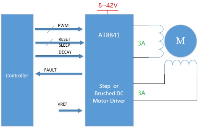AT8841為打印機和其它電機一體化應用提供一種雙通道集成電機驅(qū)動方案。AT8841有兩路H橋驅(qū)動,最大輸出42V 3A,可驅(qū)動兩路刷式直流電機,或者一路雙極步進電機,或者螺線管或者其它感性負載。雙極步進電機可以以整步、2細分、4細分運行,或者用軟件實現(xiàn)高細分。 |