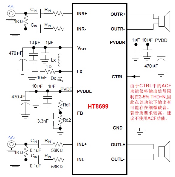 HT8699內(nèi)部集成免濾波器數(shù)字調(diào)制技術(shù),能夠直接驅(qū)動揚(yáng)聲器,并最大程度減小脈沖輸出信號的失真和噪音。輸出無需濾波網(wǎng)絡(luò),極少的外部元器件節(jié)