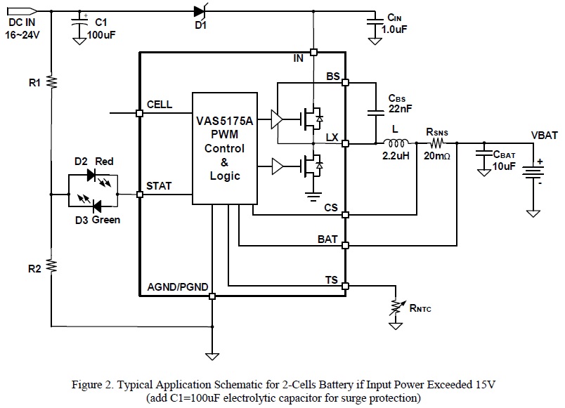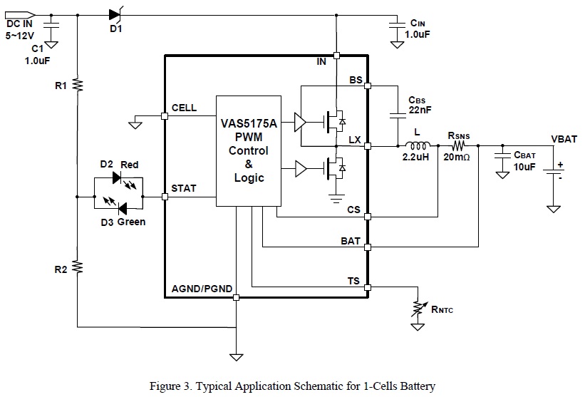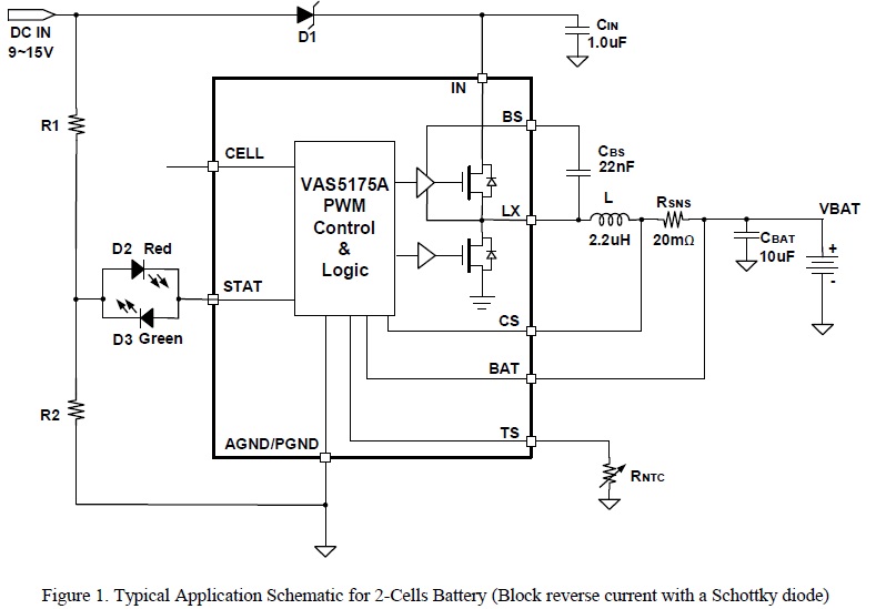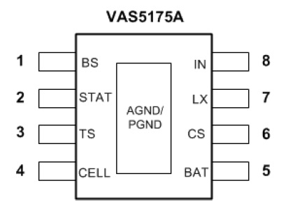 VAS5175H 是一款5V-24V 輸入,開(kāi)關(guān)降壓型1節(jié)4.35V/2節(jié)8.7V鋰離子/聚合物電池充電芯片, 以高精度調(diào)節(jié)2A 充電電流,和電池電壓。它密切監(jiān)測(cè)電池組的溫度只在設(shè)置安全溫度范圍下允許充電,還提供電池檢測(cè)、預(yù)充電調(diào)節(jié)、充電飽充和充電狀態(tài)指示等功能。 |