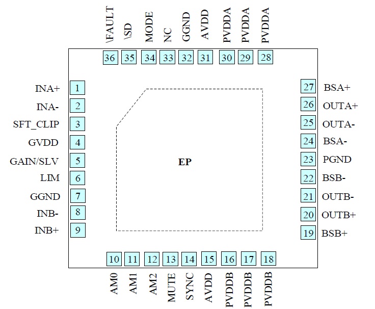 I2S數(shù)字輸入33W立體聲D類音頻功放芯片、內(nèi)置DSP小音量低頻增強等算法 |